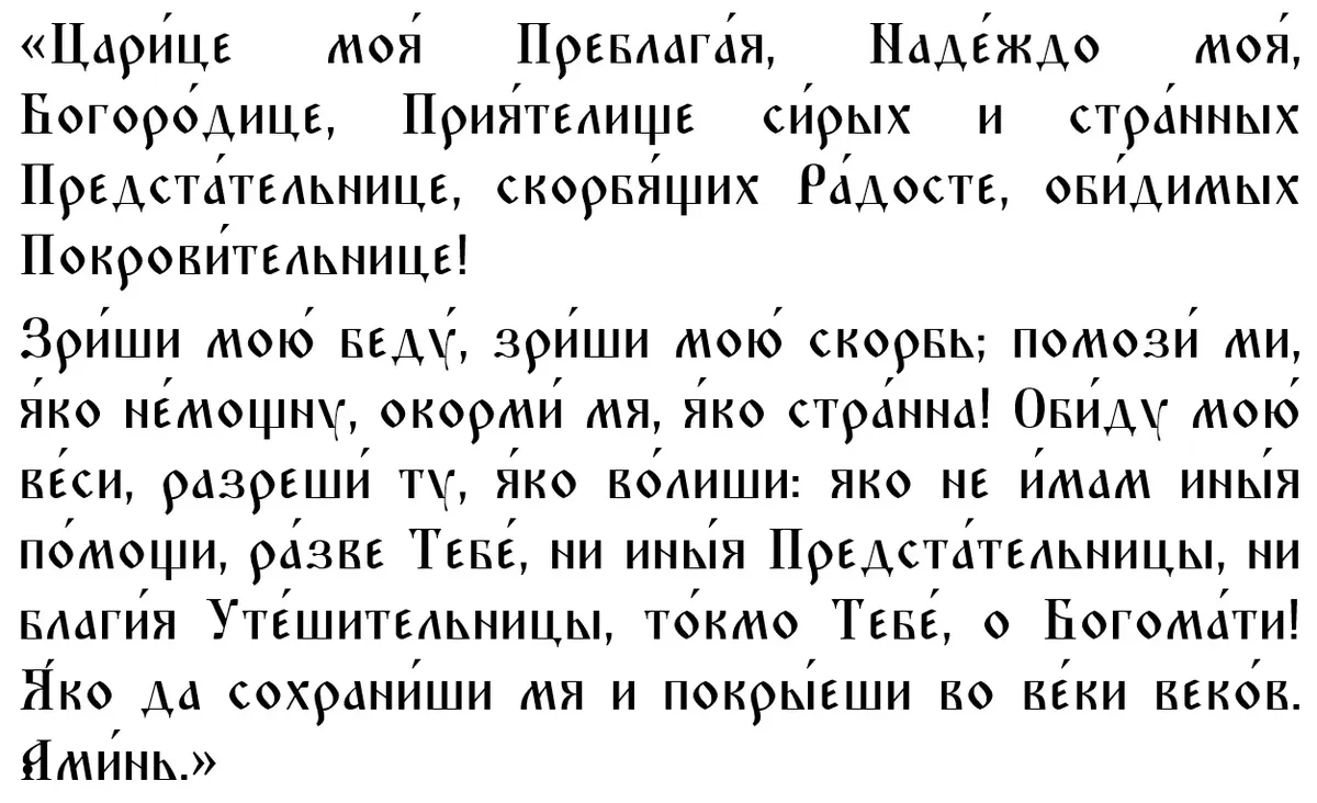 В этот день каждый верующий человек может обратиться к Деве Марии за помощью. Чаще всего в этот праздник прихожане РПЦ просят о здоровье, мире, благополучии, защите, муже и рождении ребенка. Помогает она всем людям, которые не стесняются просить о помощи, главное правило — искренне молиться, верить в то, что вы хотите получить от Божией Матери.