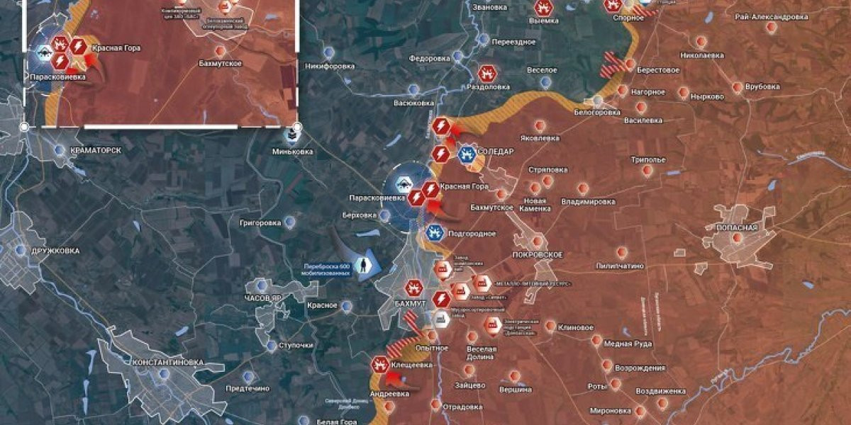 - На юго-западе от Соледара идут активные бои на южной окраине Красной горы и в Парасковиевке возле реки Бахмутка. После освобождения ж/д станции Соль село Благодатное фактически отрезано от линий снабжения из Северска и Бахмута.