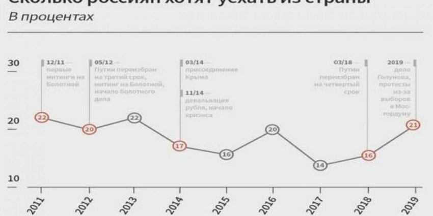 А вот результаты еще одного опроса в России, позволяющие проанализировать динамиу эмиграционных настроений в России с 2011 по 2019-й год. Как видите, эта цифра не превышает 22% и практически никак не зависит от политической коньюктуры. 2014-й год — тому пример.