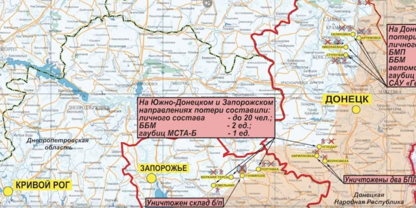 - Общие потери противника на Донецком направлении за сутки составили до 300 украинских военнослужащих, одна боевая машина пехоты, шесть боевых бронированных машин, два автомобиля, гаубица Д-20, а также самоходная артиллерийская установка «Гвоздика».