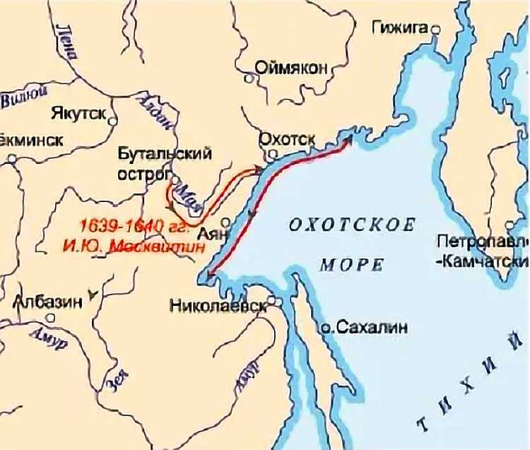 Отряд Москвитина прошел по рекам Майя, Нудыми, Улья и в августе 1639 года вышел на побережье Охотского моря. Русские люди впервые увидели Тихий океан.