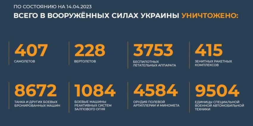 Всего с начала проведения специальной военной операции уничтожено: 407 самолетов, 228 вертолетов, 3753 беспилотных летательных аппарата, 415 зенитных ракетных комплексов, 8672 танка и других боевых бронированных машин, 1084 боевые машины реактивных систем залпового огня, 4584 орудия полевой артиллерии и минометов, а также 9504 единицы специальной военной автомобильной техники.