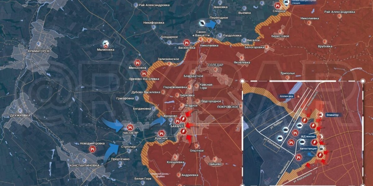 - Тем не менее украинские формирования пытаются контратаковать и сдерживать продвижение на западную окраину. Чуть севернее вокзала «вагнеровцы» выбили ВСУ из района Артемовского элеватора.