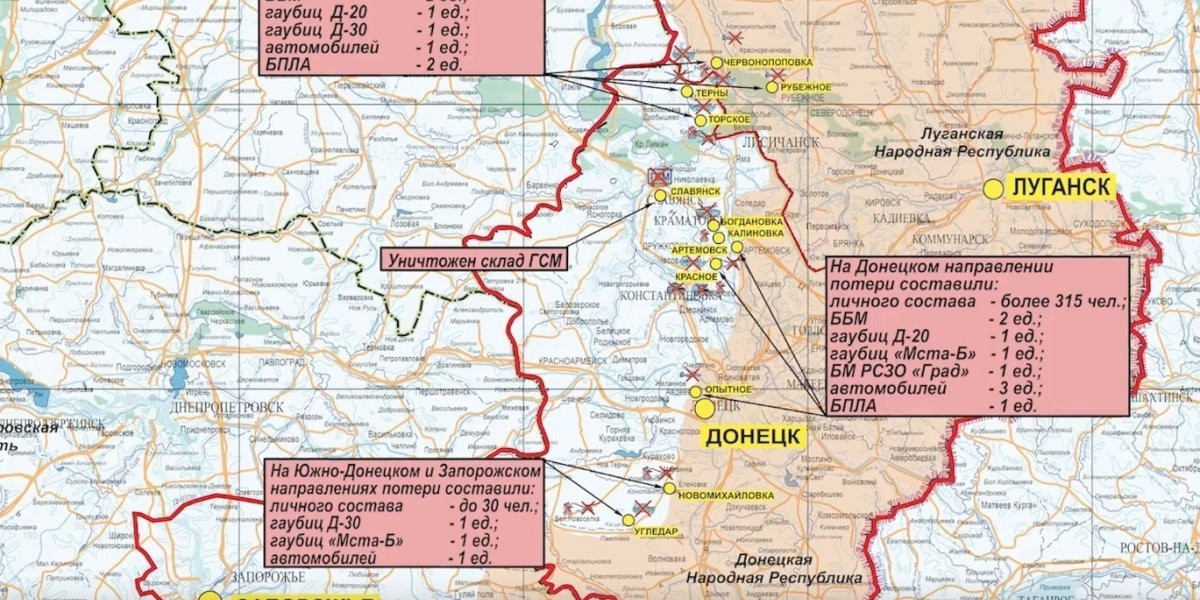 - Потери противника за сутки на данном направлении составили до 145-ти украинских военнослужащих, два танка, боевая машина пехоты, две боевые бронированные машины, три пикапа, два автомобиля, гаубица «Мста-Б», две гаубицы Д-20, а также пусковая установка РСЗО «Ураган».