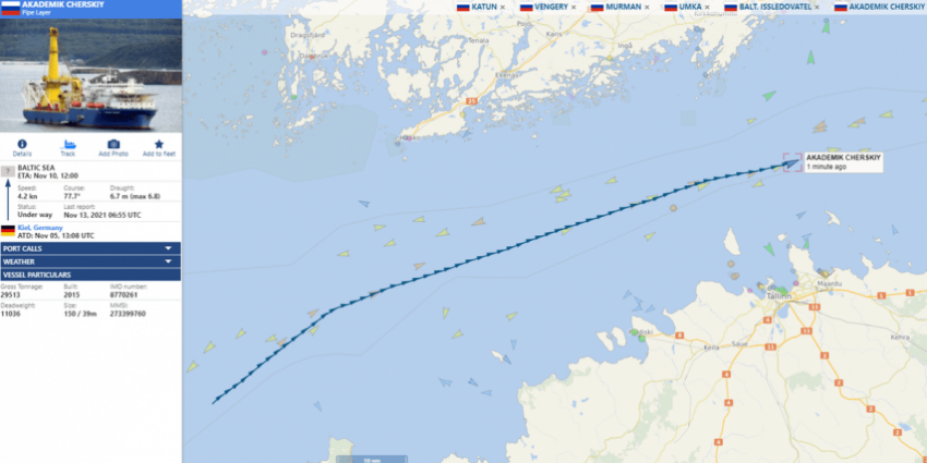 Вот прямо сейчас (13.11.21) трубоукладчик минует Таллин, и уверенно движется в сторону Санкт-Петербурга. Местом назначение, как это обычно и бывает у Академика Черского, указано Балтийское море с датой прибытия 10-го ноября, но сегодня уже 13-е, а движение продолжается