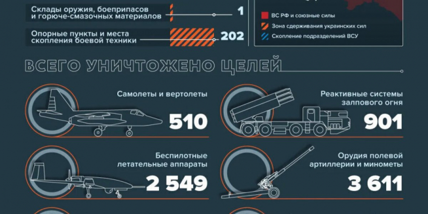 💥 Оперативно-тактической и армейской авиацией, ракетными войсками и артиллерией поражены 11 пунктов управления ВСУ в районах населенных пунктов Чугуев, Кисловка, Крахмальное, Берестовое, Кругляковка Харьковской области, Победа, Доброволье, Водяное Донецкой Народной Республики, Садовое, Токаревка, Дудчаны Херсонской области, а также 63 артиллерийских подразделения на огневых позициях, живая сила и военная техника в 136-ти районах.