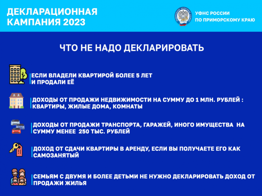 Заместитель руководителя УФНС России по Приморью напомнила, кому не нужно декларировать доходы и заполнять декларации. Как правило, это те, кто владел квартирой более пяти лет и продал её в 2022 году. От декларирования доходов от продажи жилья освобождены семьи с двумя и более детьми при соблюдении определённых условий.