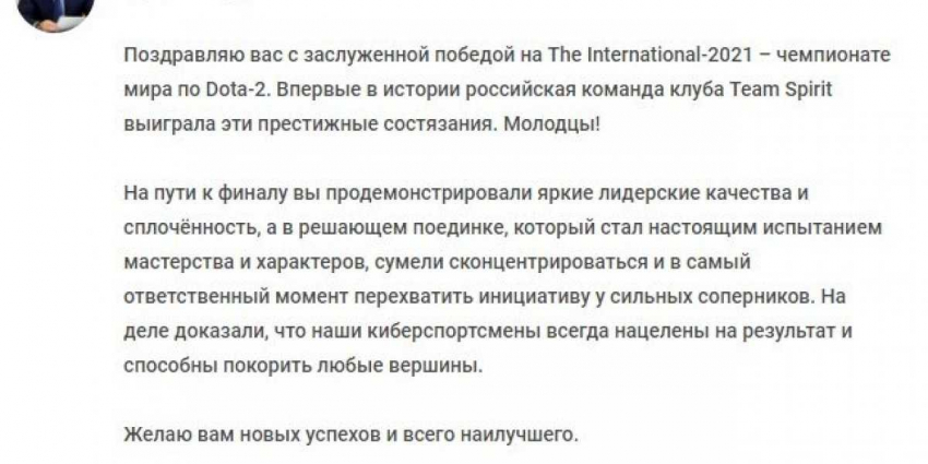 Президент Владимир Путин поздравил российских игроков Team Spirit с завоеванием престижного титула на The International 10 — чемпионате мира по киберспорту по популярной видеоигре Dota 2.