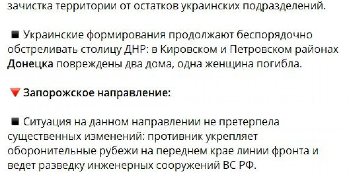 - В представительстве ДНР в Совместном центре по контролю и координации вопросов, связанных с военными преступлениями Украины сообщили, что ВСУ нанесли очередной удар по Кировскому району Донецка с использованием восьми снарядов «натовского» калибра 155 миллиметров.