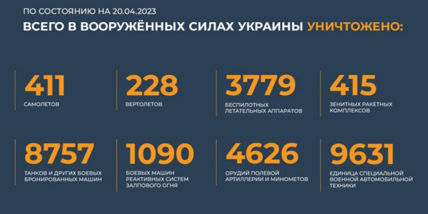 Всего с начала проведения специальной военной операции уничтожены: 411 самолетов, 228 вертолетов, 3779 беспилотных летательных аппаратов, 415 зенитных ракетных комплексов, 8757 танков и других боевых бронированных машин, 1090 боевых машин реактивных систем залпового огня, 4626 орудий полевой артиллерии и минометов, а также 9631 единица специальной военной автомобильной техники.