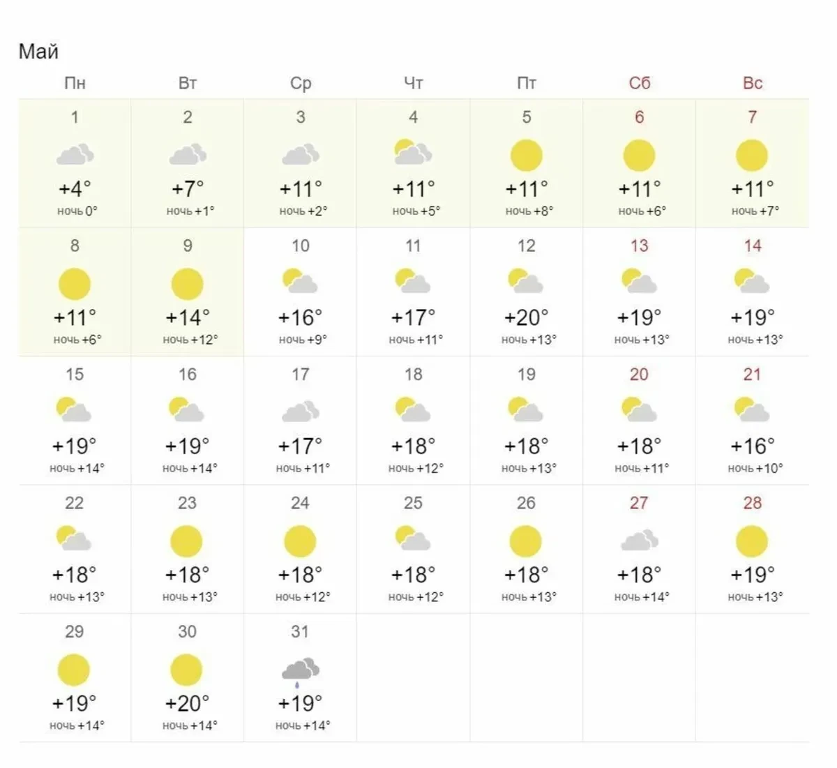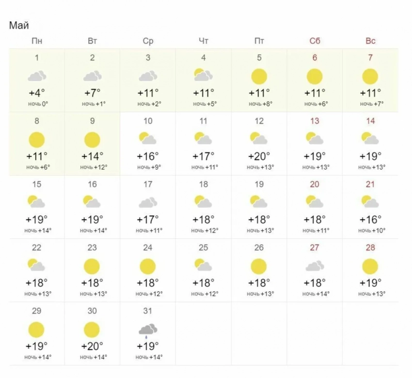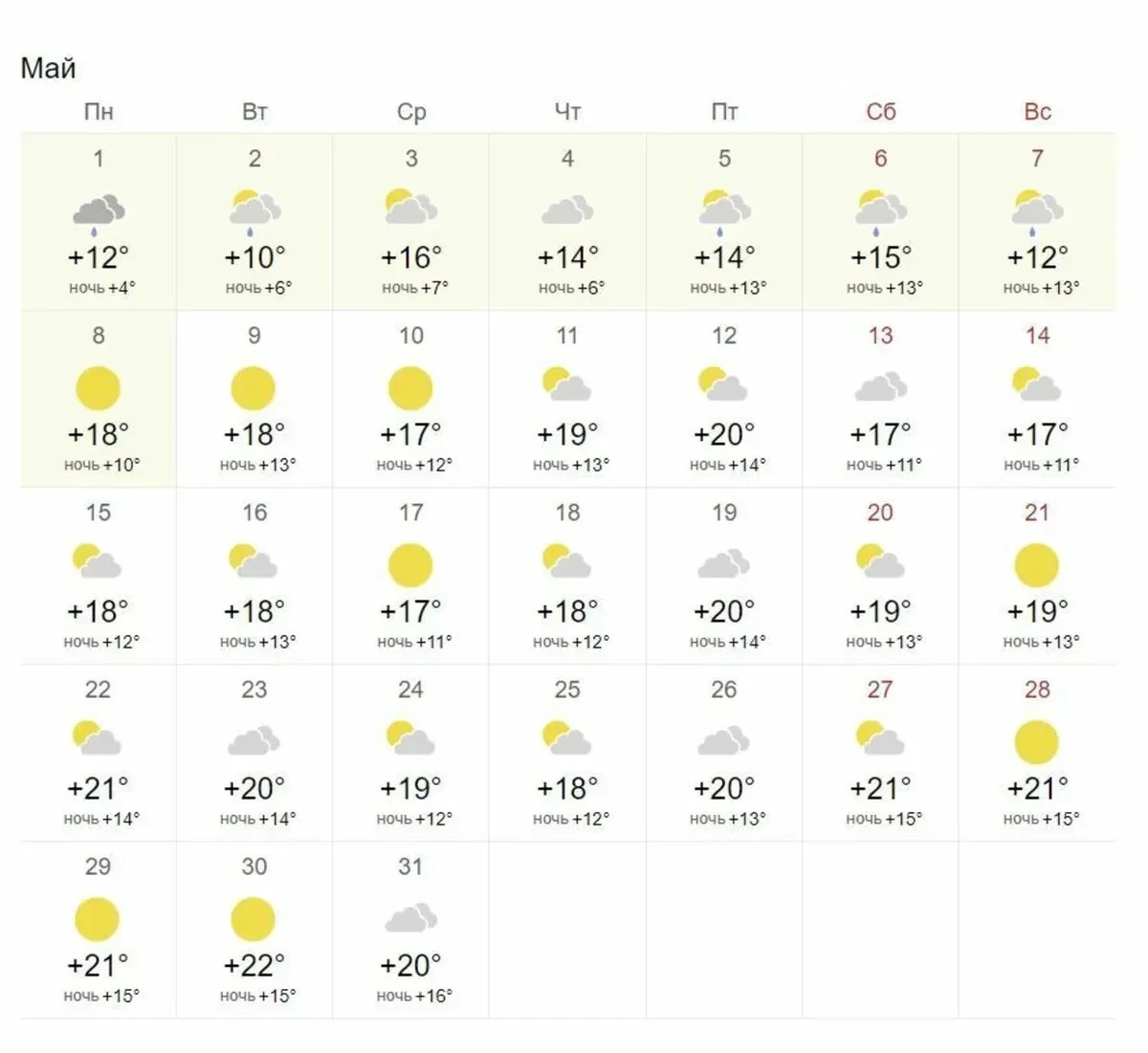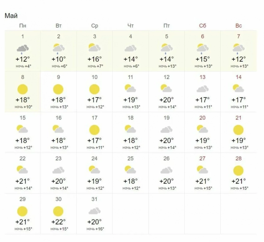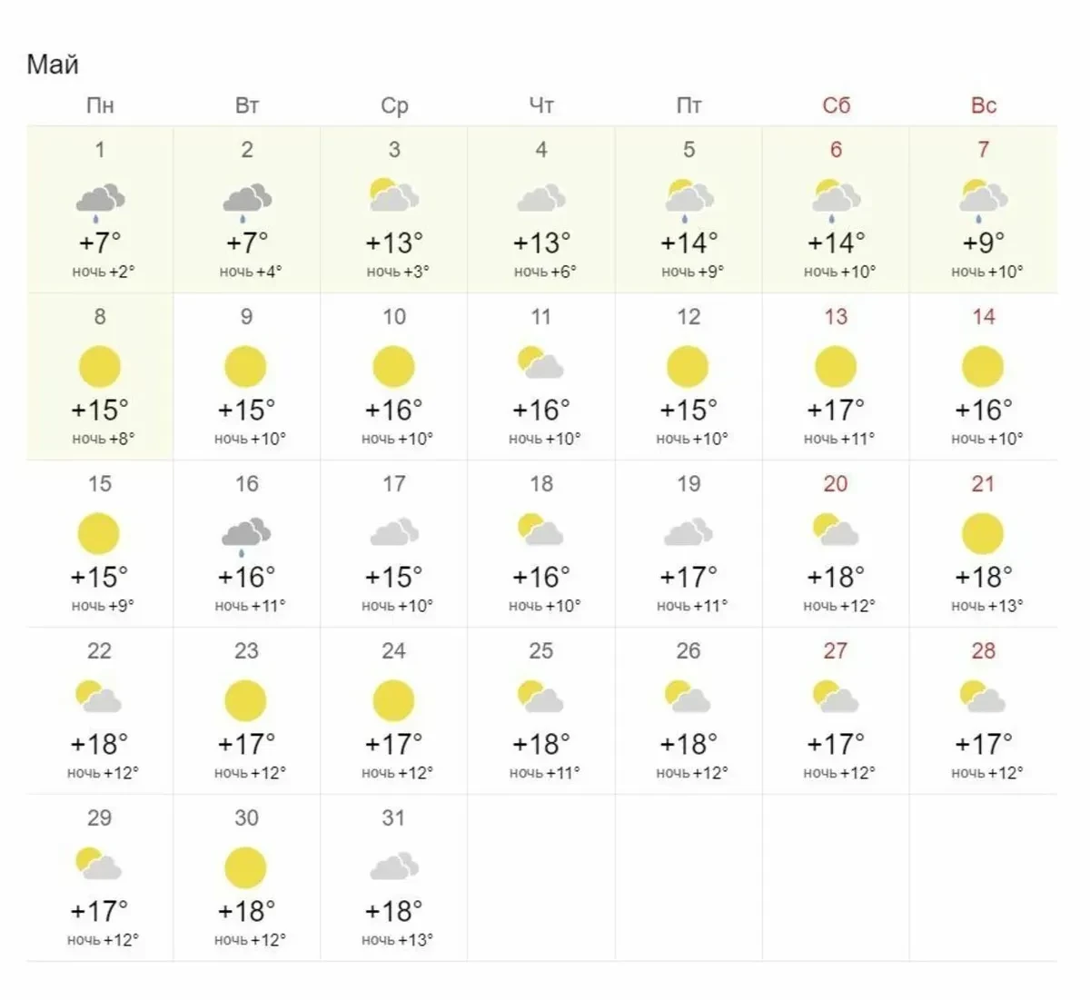 В мае температура воздуха начнет повышаться. Ожидается, что ко второй неделе она поднимется до средних +15 градусов. Однако серьезного роста температуры в дальнейшем ждать не стоит. Также 1, 2, 5, 6 и 7 мая прогнозируются дожди.