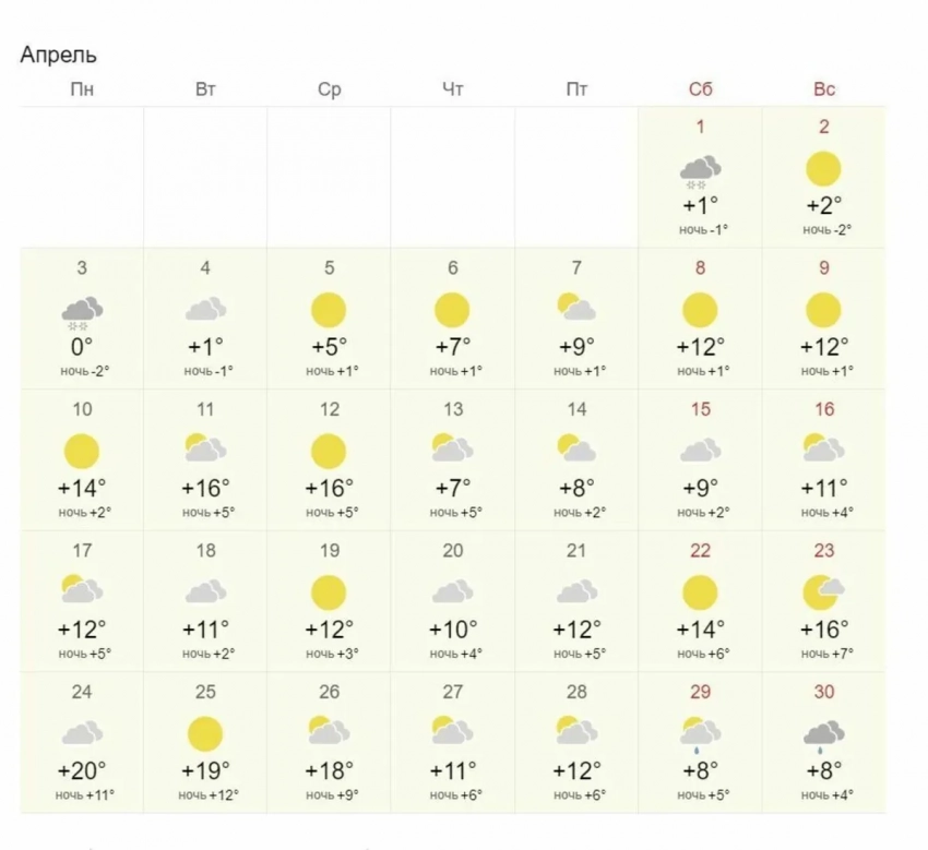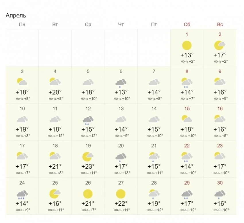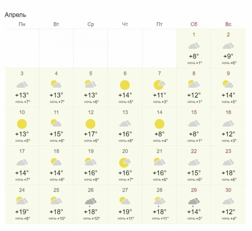 Последняя неделя в апреле будет теплой. Лишь в последние дни месяца ожидается небольшое похолодание с +18 до +12 градусов. Также 28 и 29 апреля прогнозируются дожди.