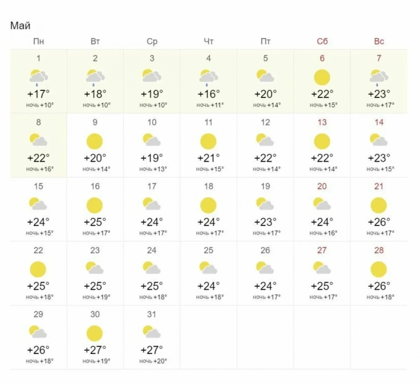 В мае-2023 температура воздуха будет постепенно повышаться: с +17 до +23 градусов. 1, 2, 4 и 7 мая ожидаются дожди. К концу весны ожидается потепление до +27 градусов.