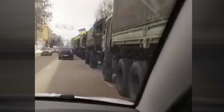 На кадрах показана большая колонна военных грузовиков и БТР, на бортах которых были нарисованы украинские флаги, на крышах некоторых транспортных спецсредств также развевались флаги соседней страны.
