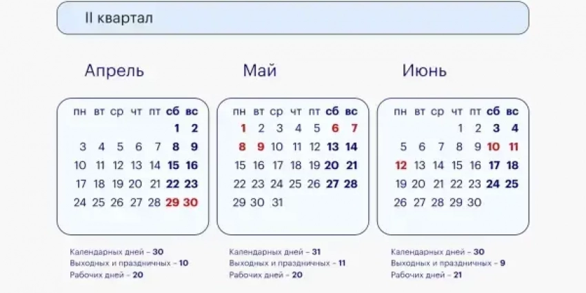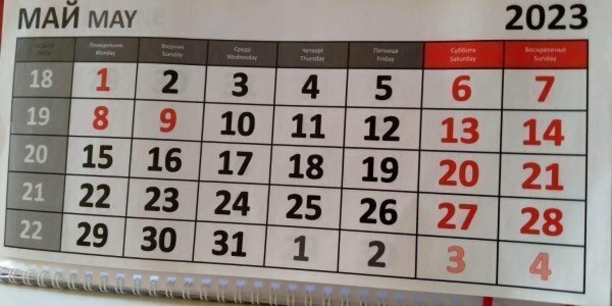 Нерабочие дни по случаю 1 мая, Праздника Весны и Труда, — три дня (с 29 апреля по 1 мая) и 9 мая, ко Дню Победы, — четыре дня (с 6 по 9 мая).