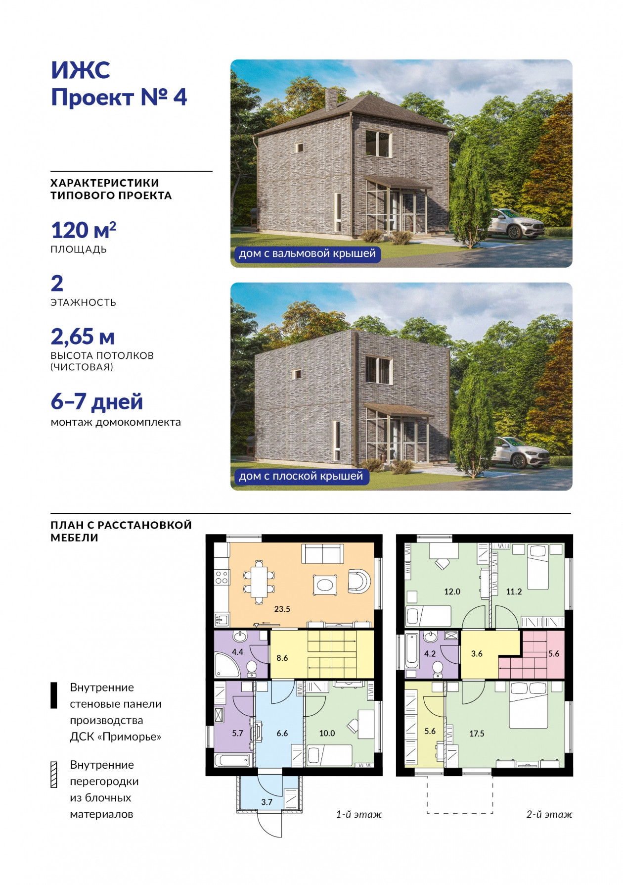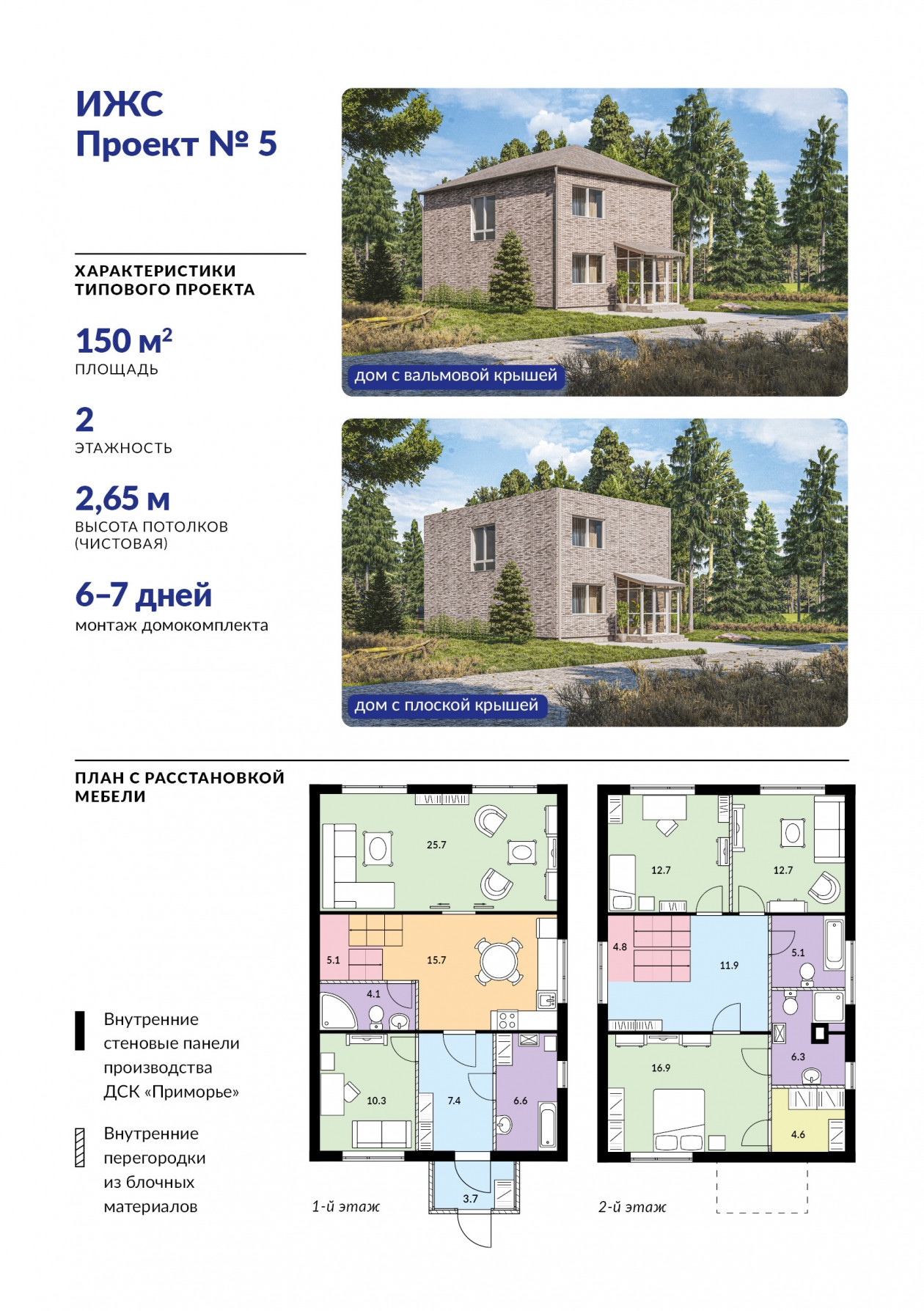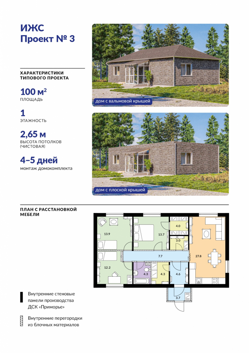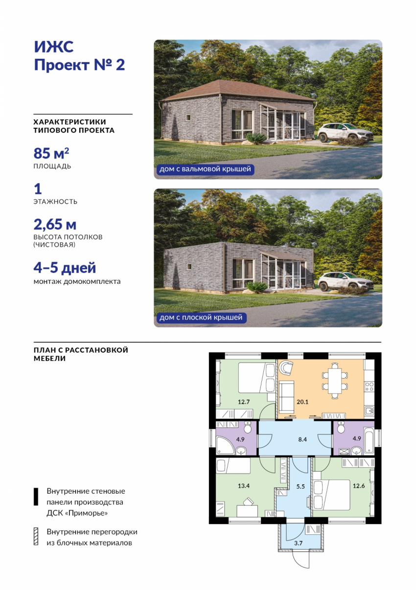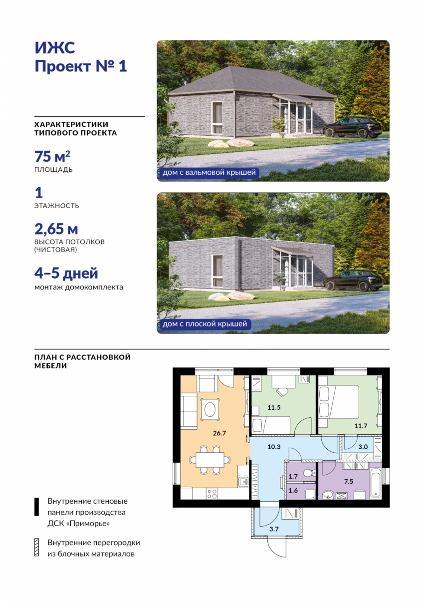 Сейчас застройщики могут зарезервировать мощности ДСК “Приморье” для производства домокомплектов по готовым проектам для строительства домов пяти типов: одноэтажных коттеджей площадью 75 кв. метров, 85 кв. метров или 100 кв. метров, а также двухэтажных коттеджей площадью 120 кв. метров или 150 кв. метров. В будущем линейку проектных решений планируется расширить. Заказчик может выбрать тип крыши — плоскую или скатную (вальмовую), а также варьировать количество и размеры оконных проемов в наружных стенах. Помимо этого, застройщики практически не ограничены в цветовых решениях для фасадов — доступны десятки оттенков плитки и их сочетаний.