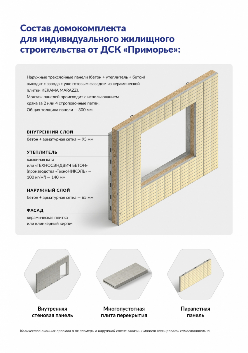 В домокомплект для ИЖС от ДСК “Приморье” входят: наружные трехслойные стеновые панели уже с утеплителем и готовым фасадом из керамической плитки KERAMA MARAZZI, внутренние стеновые панели, плиты перекрытия, парапетные панели (поставляются при строительстве дома с плоской крышей).