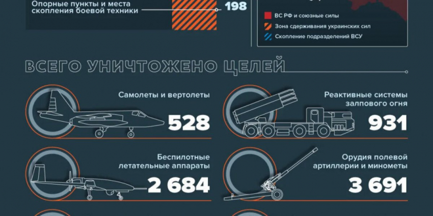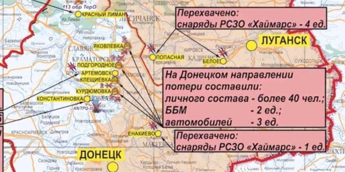 Министерство обороны России в брифинге сообщило, что в течение суток были поражены скопления живой силы противника на Купянском и Лиманском направлениях. В районе населенного пункта Розовка уничтожено 4 украинских ДРГ. Совокупные потери ВСУ составили порядка 90 военнослужащих, БМП, 2 боевые бронемашины и 4 автомобиля.