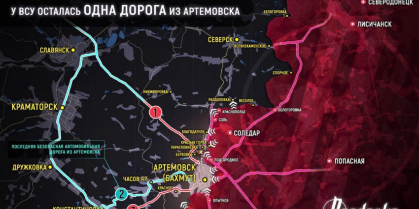 С северного направления ВСУ в районе Парасковиевки взорвали железнодорожный мост, перекрыв тем самым дорогу на Славянск. С западного направления трасса, ведущая от Красного (Ивановского) находится под огневых контролем ВС РФ. На данный момент для взятия Артемовска в оперативные клещи, осталось взять дорогу на Часов Яр.