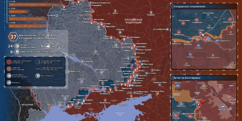 Донбасс сегодня 5 мая 2023. Карта боевых действий, новости с фронта, сводки, обзор, итоги военной спецоперации (СВО) России на Украине 05.05.2023 Обстановка на Донбассе и Украине на сегодняшний день, 5 мая, карта боевых действий и продвижения войск РФ, последний брифинг Минобороны, свежие видео-сводки от Юрия Подоляки, Игоря Конашенкова и Михаила Онуфриенко — собрали актуальные новости по Украине. 05.05.2023 г. — четыреста тридцать шестой день военной спецоперации РФ на территории Украины по демилитаризации страны.
