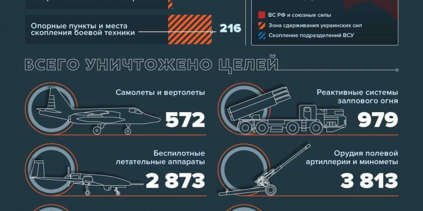 Ударами оперативно-тактической и армейской авиации, ракетных войск и артиллерии поражены 2 склада боеприпасов ВСУ в Запорожской области, а также 76 артиллерийских подразделений, живая сила и военная техника в 123 районах.