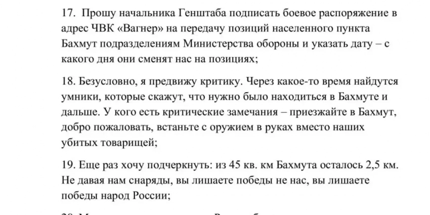 По словам Пригожина, к 9 Мая вагнеровцы хотели овладеть Бахмутом, но увидев ситуацию глубоко возмутились. Ни на одно обращение отправленное им в Минобороны ранее, ответ не поступил.