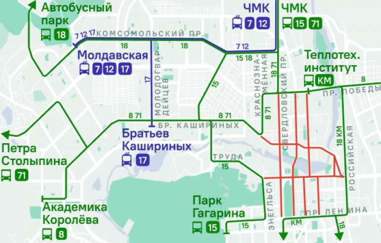 - Автобус КМ «Теплотехнический институт — проспект Победы — Российская — проспект Ленина — Свердловский проспект — Блюхера — Областная больница» (маршрут будет работать с увеличенными интервалами).