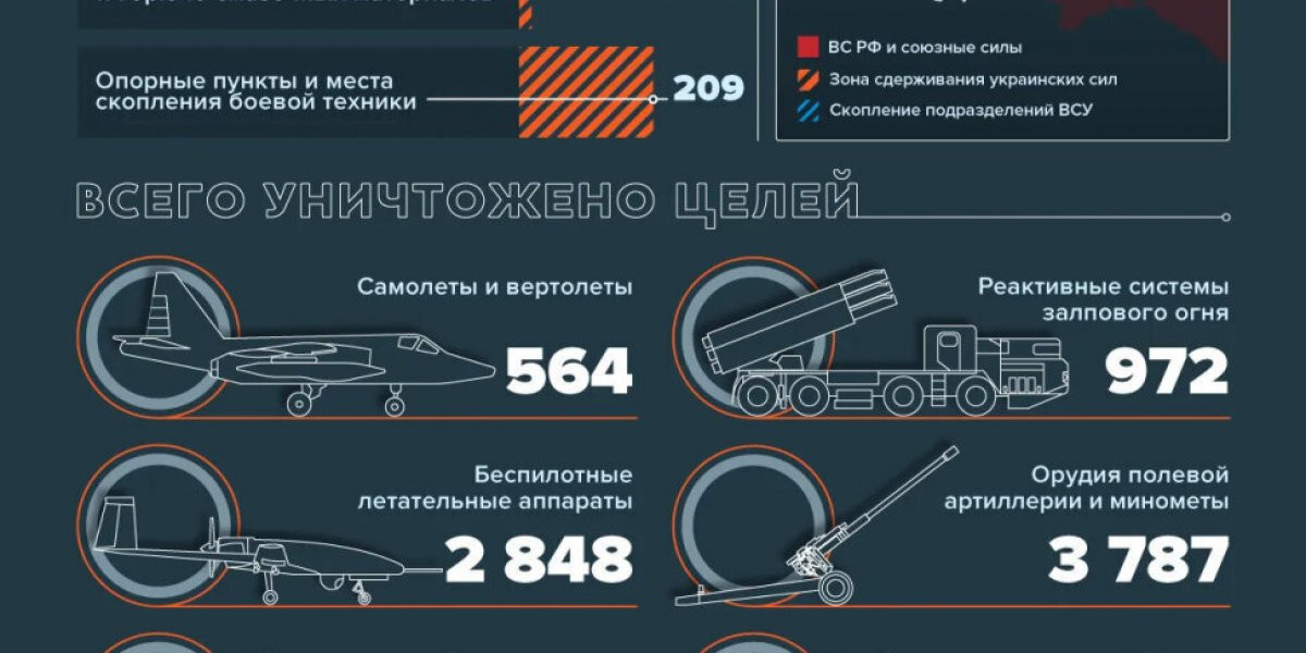Ударами оперативно-тактической и армейской авиации, ракетных войск и артиллерии поражены склады ВСУ в Донецкой Народной Республике (ДНР), а также 84 артиллерийских подразделения, живая сила и военная техника в 117 районах. В ходе контрбатарейной борьбы поражены расчеты гаубичной батареи и РСЗО «Град» в ДНР.