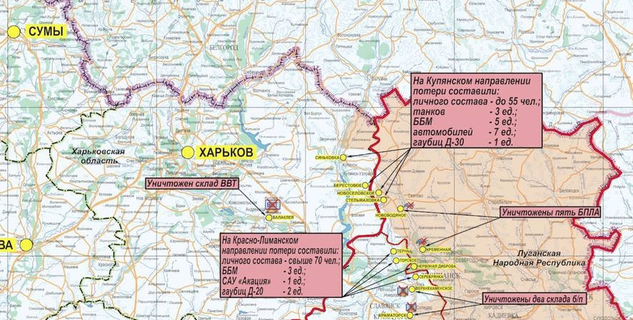 Кроме того, в районах населенных пунктов Синьковка и Берестовое Харьковской области пресечены действия двух украинских диверсионно-разведывательных групп.