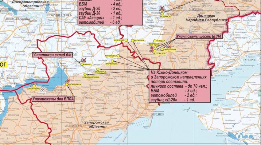 Кроме того, в районах населенных пунктов Водяное Донецкой народной республики и Кирово Запорожской области уничтожены два склада боеприпасов 72-й механизированной и 128-й горно-штурмовой бригад ВСУ.
