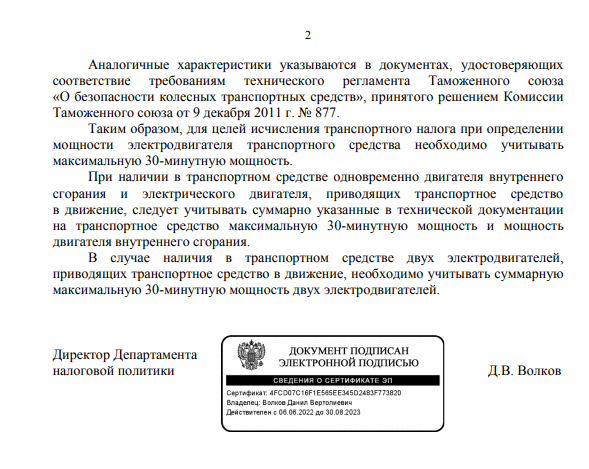 Минфин указал, что при наличии в транспортном средстве одновременно двигателя внутреннего сгорания и электрического двигателя следует учитывать суммарно указанные в технической документации на транспортное средство максимальную 30-минутную мощность и мощность двигателя внутреннего сгорания.