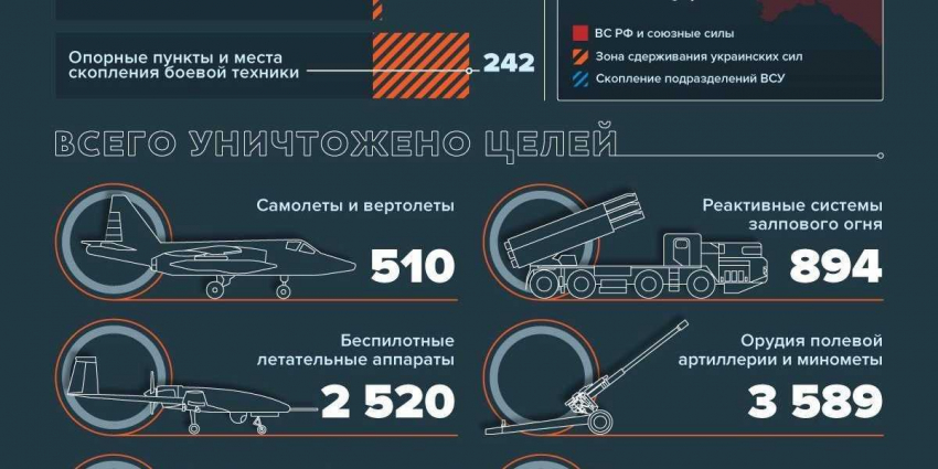 Министерство обороны России в ежедневном брифинге сообщило, что в течение суток высокоточными ударами были уничтожены цеха оборонного предприятия по производству топлива и ракетных двигателей для ВСУ в Днепропетровской области. В городе Запорожье уничтожены цеха научно-производственного комплекса «Искра», где производились электронные компоненты для ремонта радиолокационных станций (РЛС) ВСУ и реактивных систем залпового огня (РСЗО).