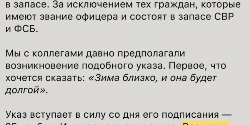 Хотя власти объявили мобилизацию законченной, Путин так и не подписал указ, которые формально завершил бы ее. Гарантий, что новой волны мобилизации в России не будет, сейчас не может дать никто, заявил в интервью «Ведомостям» 8 декабря председатель комитета Совета Федерации по конституционному законодательству и госстроительству Андрей Клишас.