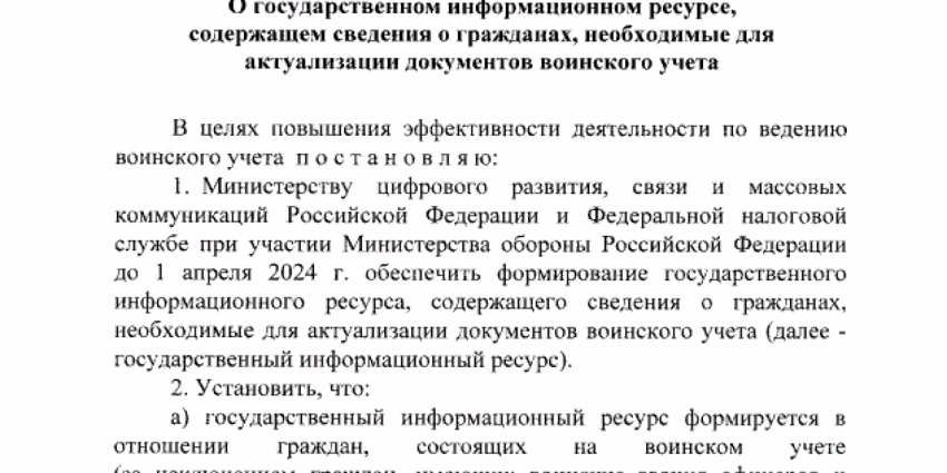 Президент России Владимир Путин поручил Минцифры и Федеральной налоговой службе совместно с Минобороны создать до 1 апреля 2024 года информационный ресурс со сведениями, необходимыми для актуализации документов воинского учета граждан. Это необходимо «в целях повышения эффективности деятельности по ведению воинского учета», говорится в тексте указа, который подписан президентом 25 ноября и опубликован на официальном интернет-портале правовой информации.