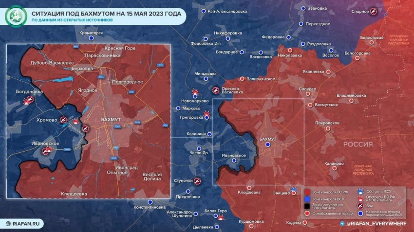 В ночь на 15 мая бойцы ЧВК «Вагнер» взяли под контроль супермаркет «Семья» в Артемовске, вбивая клин между укрепленными районами ВСУ «Гнездо» и «Конструктор». При этом последний район охватывается с трех направлений - «оркестранты» активно продвигаются в частном секторе.
