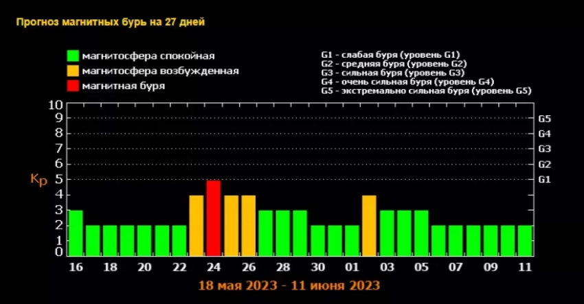 Связано это с тем, что 24 мая прогнозируется магнитная буря уровня G1 (слабая).