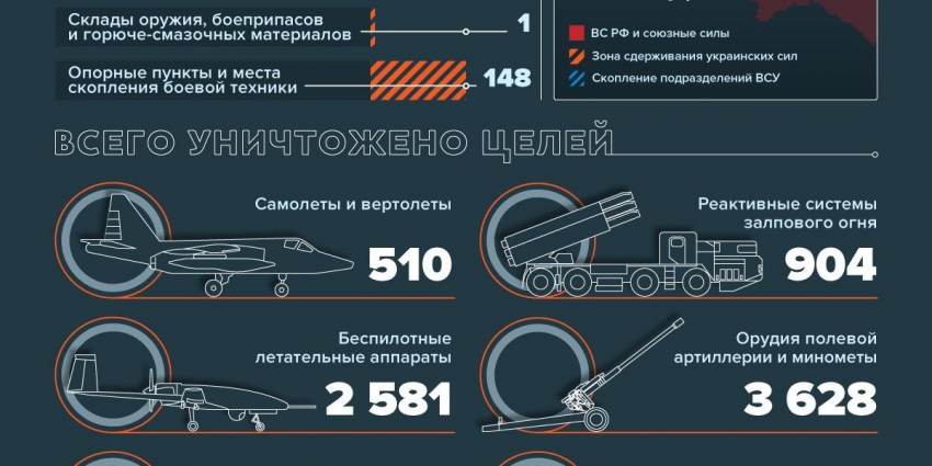 Российские военные также поразили 10 пунктов управления противника в Донецкой Народной Республике (ДНР), Харьковской и Херсонской областях, а также украинский ЗРК «Оса-АКМ» в Макеевке в Луганской Народной Республике (ЛНР), радиолокационную станцию контрбатарейной борьбы AN/TPQ-37 возле Николаевки в ДНР, радиолокационную станцию целеуказания зенитным ракетным комплексам «Пеликан» в районе Маломихайловки Днепропетровской области и склад ракетно-артиллерийского вооружения ВСУ близ Белогорья Запорожской области.