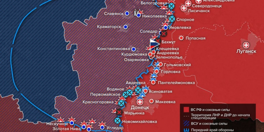 Штурмовые отряды ЧВК «Вагнер» установили контроль над Курдюмовкой в ДНР и вышли к каналу Северский Донец. В ближайшие дни следует ожидать начала активных боев в окрестностях Клещеевки и Опытного под Бахмутом.
