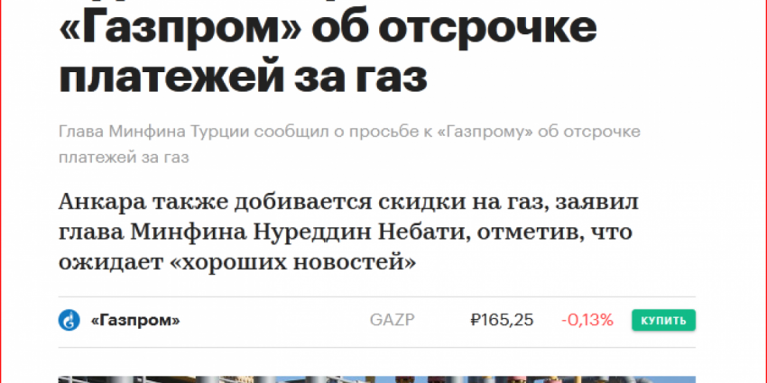 СМИ публикуют пояснения главы Министерства финансов Турции, что в Анкаре запросили о возможности предоставления отсрочки по платежам за поставляемый газ. Просят Газпром предоставить отсрочку до… 2024 года. Кроме этого сообщается и о просьбе рассмотреть возможность сделать скидку.