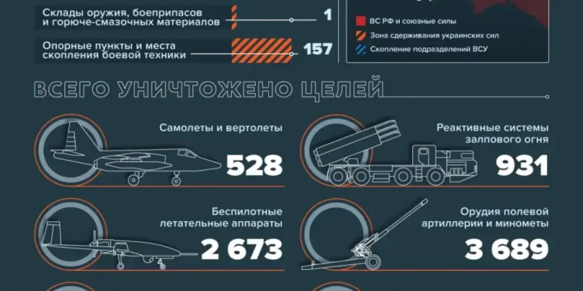 На Красно-Лиманском направлении в ходе наступательных действий на отдельных направлениях и ударов артиллерии за сутки уничтожено более 50-ти украинских военнослужащих, две боевые машины пехоты и три пикапа. Кроме того, в районах населенных пунктов Терны Донецкой Народной Республики и Червоная Диброва Луганской Народной Республики обнаружены и уничтожены три диверсионно-разведывательные группы ВСУ.