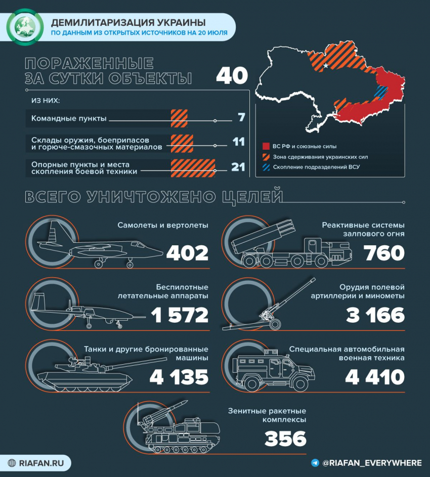 Сводка Министерства обороны Российской Федерации о ходе проведения специальной военной операции на территории Украины. Главное за 20.07.2022 г.