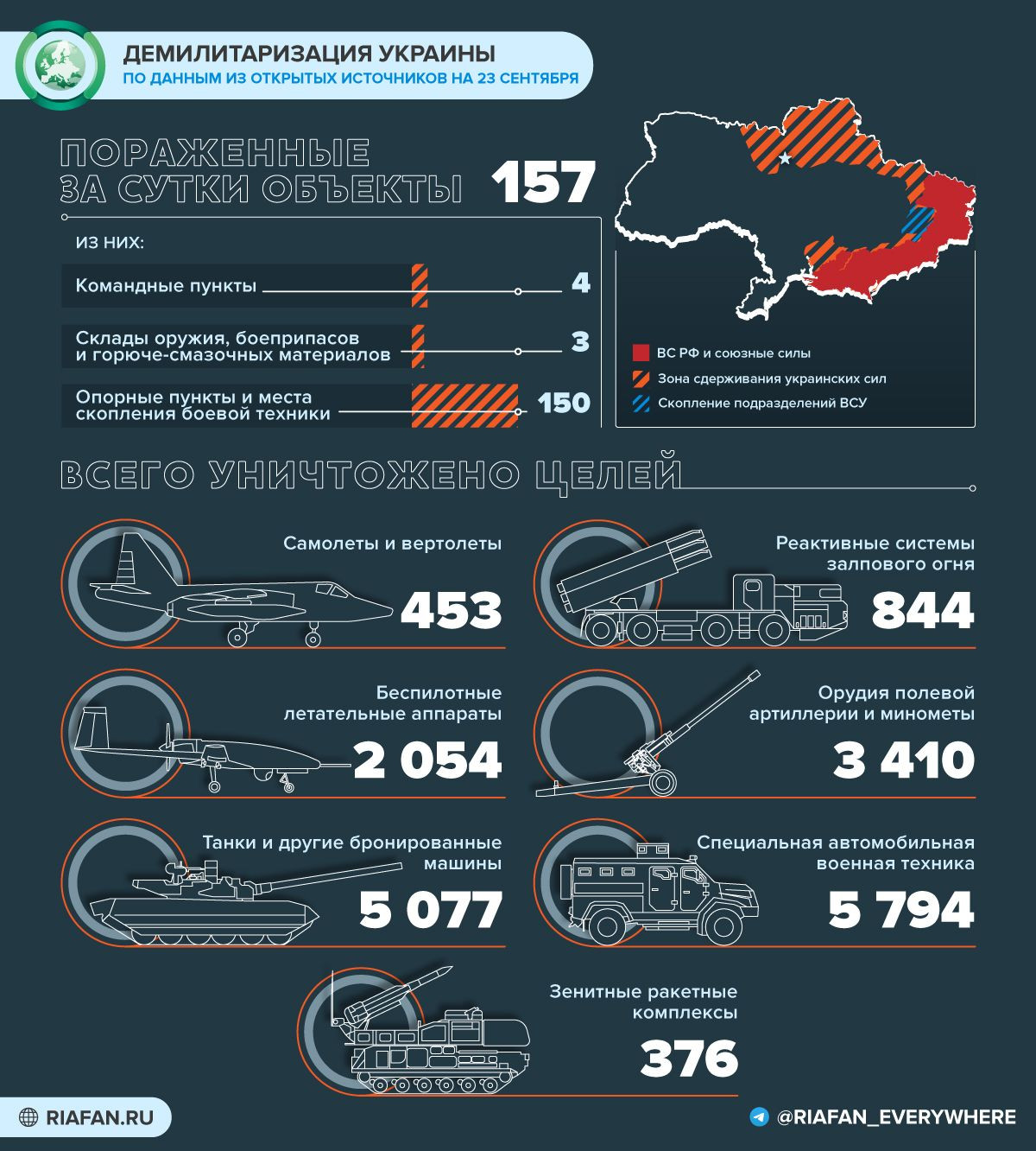 По данным оборонного ведомства, ВС РФ поразили склад боеприпасов в населенном пункте Донецкое, а также уничтожили украинский ЗРК «Бук-М1» в районе Никифоровки. В Камышевахе истребительной авиацией ВКС России сбит Су-25 ВВС Украины.